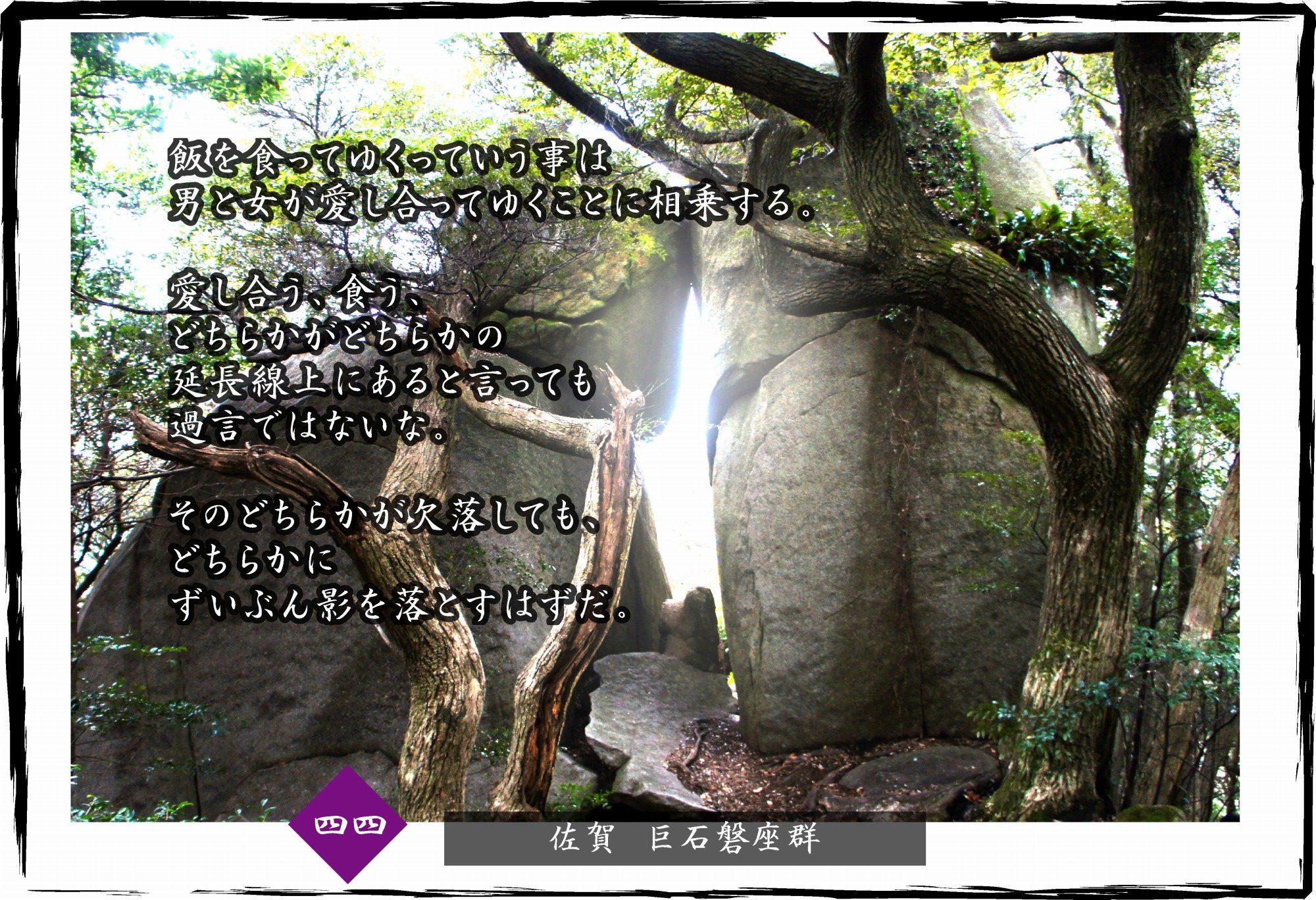 飯を食って行くってことは 男と女が愛しあってゆくことに相乗する 愛しあう 食う どちらかがどちらかの 延長...